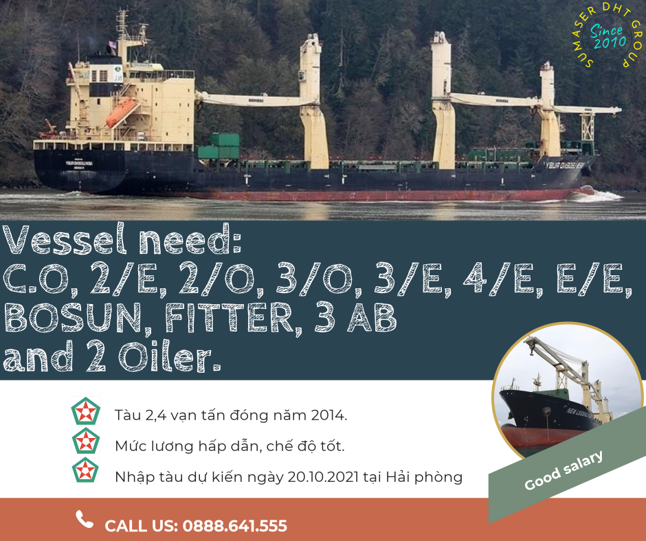 Công ty cổ phần SUMASER - DHT cần tuyển gấp Đại phó, Phó 2, Phó 3, Máy 2, Máy 3, Máy 4, Sỹ quan điện, Bosun, Fitter, 3AB và 2 Oiler OSD, OSE cho tàu hàng 2,4 vạn đóng năm 2014 với mức lương cụ hấp dẫn.